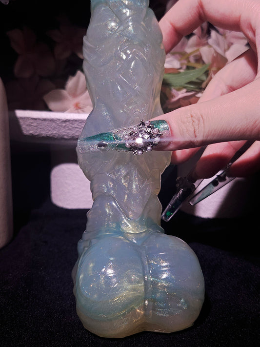 Emerald Serpent Press-On Nails, Handmade Green Chrome with Dripping Glitter & Crystals